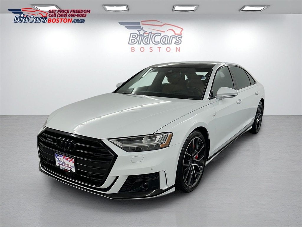 BidCars Boston is proud to present you with another True Market Priced Pre-Owned Vehicle. This 2021 Audi A8 4.0 LWB quattro L is loaded with the following Factory Options: Brown Leather Black Optic Exterior Package, Black Optic Package (Audi Dynamic All-Wheel-Steering and Wheels: 20" Audi Sport 5-V-Spoke-Star-Design), Contour/Ambient LED Interior Lighting Package, Executive Plus Package (20" 10-Parallel-Spoke-Design Wheels, Acoustic & Break Resistant Dual-Pane Side Windows, Audi Active Lane Assist, Audi Adaptive Cruise Assist, Audi Side Assist, Front Seat Massage Function, Head-Up Display, Heated 4-Spoke Multifunction Steering Wheel, Heated Front Surfaces, Heated Rear Outboard Seats, Intersection Assist, Rear Matrix LED Reading Lights, Rear Seat Remote Control, and Traffic Sign Recognition), Extended Leather Package, Luxury Package (Aluminum Optic Buttons, Heated Rear Surfaces, Light Alcantara Headliner, Power Rear Outboard Seats w/Lumbar & Memory, Rear Outboard Seat Ventilation w/Massage, and USB Audi Music Interface For Rear Seats), Brown Leather, 17 Speakers, 22-Way Heated Multi-Contour Comfort Front Seats, 4-Wheel Disc Brakes, ABS brakes, Adaptive suspension, Air Conditioning, Alloy wheels, AM/FM radio: SiriusXM, Audi Black Rings & Badges Kit, Audi Guard Protection Kit, Audi smartphone interface (Apple CarPlay/Android Auto), Auto High-beam Headlights, Auto tilt-away steering wheel, Auto-dimming door mirrors, Auto-dimming Rear-View mirror, Auto-leveling suspension, Automatic temperature control, Bang & Olufsen 3D Advanced Sound System, Bang & Olufsen 3D Premium Sound System, Black Alcantara Headliner, Brake assist, Bumpers: body-color, Compass, Delay-off headlights, Door auto-latch, Driver door bin, Driver vanity mirror, Dual front impact airbags, Dual front side impact airbags, Electronic Stability Control, Emergency communication system, Four wheel independent suspension, Front anti-roll bar, Front Bucket Seats, Front Center Armrest w/Storage, Front dual zone A/C, Front fog lights, Front reading lights, Garage door transmitter: HomeLink, Genuine wood console insert, Head restraints memory, Headlight cleaning, Heated door mirrors, Heated front seats, HVAC memory, Illuminated entry, Knee airbag, Leather Shift Knob, Leather steering wheel, Low tire pressure warning, Memory seat, Natural Wood Gray-Brown Fine Grain Ash Inlays, Navigation system: MMI Navigation plus, Occupant sensing airbag, Outside temperature display, Overhead airbag, Overhead console, Panic alarm, Passenger door bin, Passenger vanity mirror, Power 2nd-Row Moonroof, Power adjustable front head restraints, Power door mirrors, Power driver seat, Power moonroof, Power passenger seat, Power steering, Power windows, Radio data system, Radio: MMI Navigation Plus, Rain sensing wipers, Rear air conditioning, Rear anti-roll bar, Rear dual zone A/C, Rear fog lights, Rear reading lights, Rear seat center armrest, Rear side impact airbag, Rear Window Blind, Rear window defroster, Remote keyless entry, Seatbelt memory, Security system, Speed control, Speed-sensing steering, Speed-Sensitive Wipers, Steering wheel memory, Steering wheel mounted audio controls, Tachometer, Telescoping steering wheel, Tilt steering wheel, Traction control, Trip computer, Turn signal indicator mirrors, Valcona Leather Seat Upholstery, Variably intermittent wipers, Ventilated front seats, and Wheels: 19" 15-Spoke Design!!